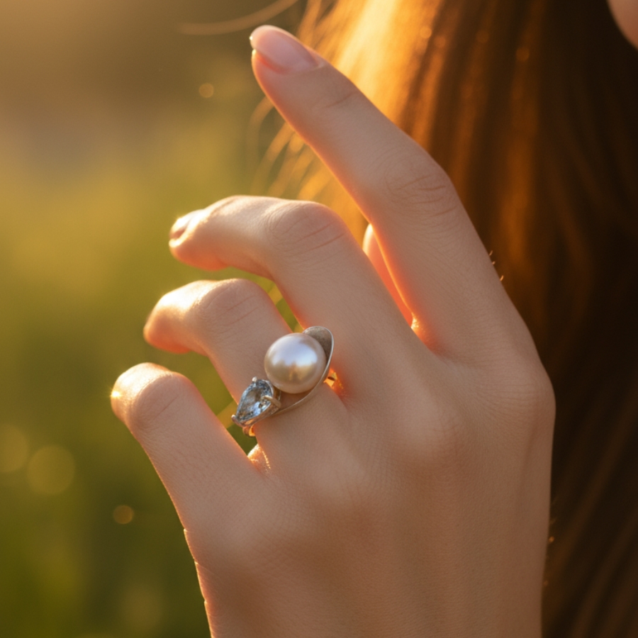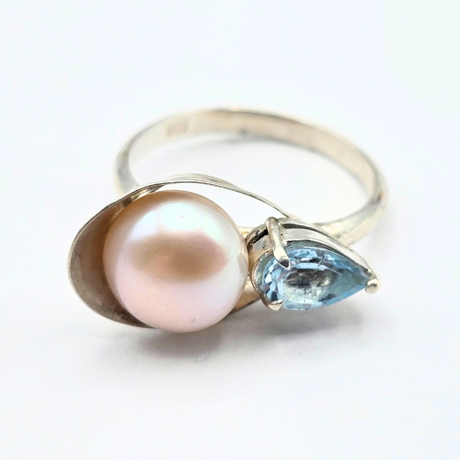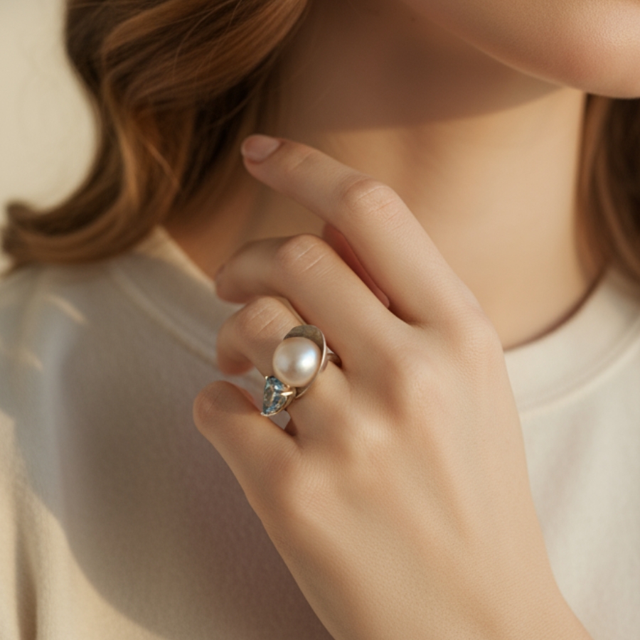 Embrace is a one-of-a-kind handmade ring in sterling silver, featuring a luminous freshwater pearl and a faceted blue topaz. The two stones meet in an elegant balance — earth and sky, calm and clarity — connected by a silver arc that gently holds them together. This piece speaks of tenderness, duality, and the beauty of contrast.