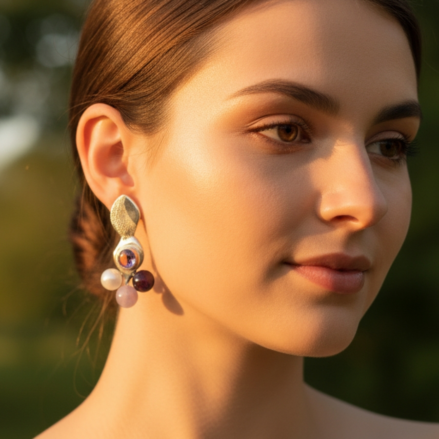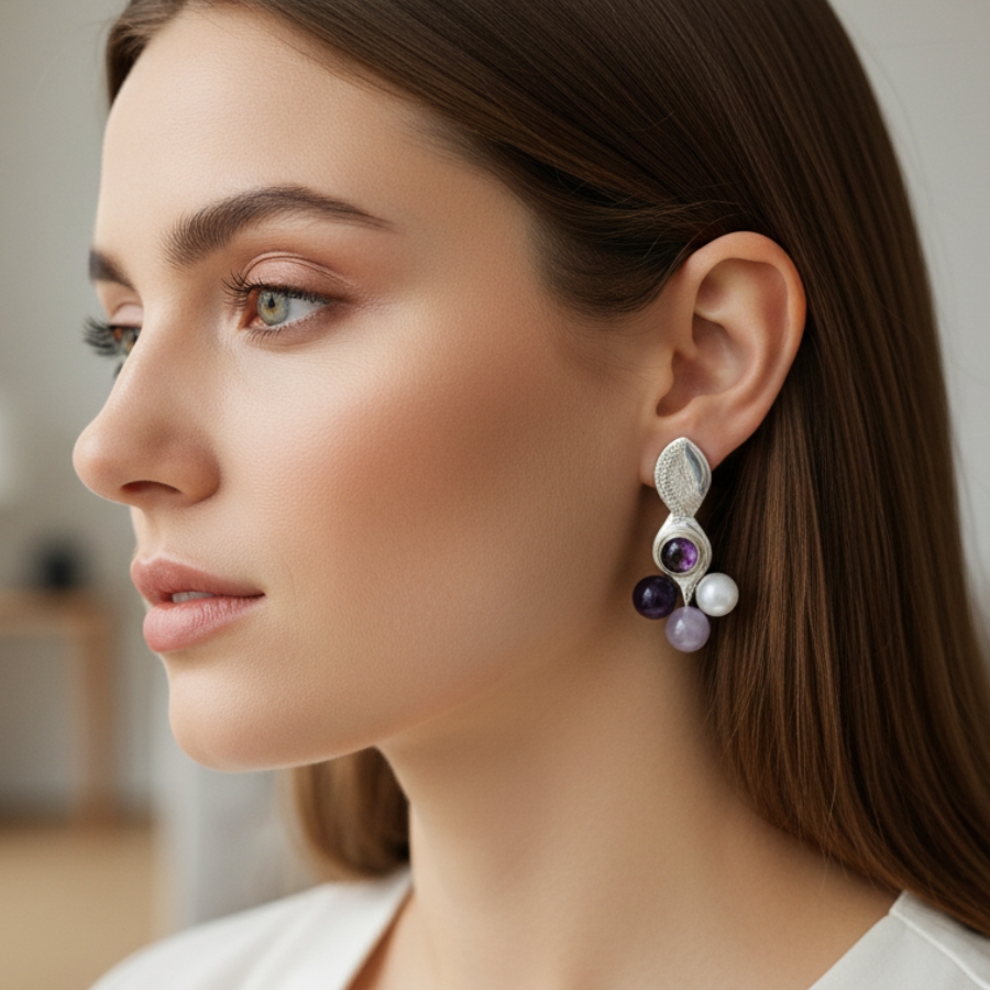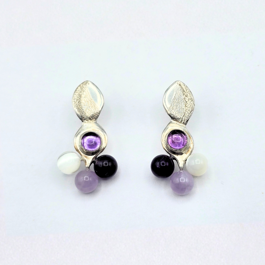 Handcrafted in North Vancouver, the Floret earrings were inspired by the moment a flower catches the first morning light. Designed and finished by founder Hedieh Ahmari, each piece reflects her love for organic form and natural rhythm. The combination of amethyst and mother of pearl symbolizes calm strength and renewal — a celebration of growth, femininity, and grace in every detail.