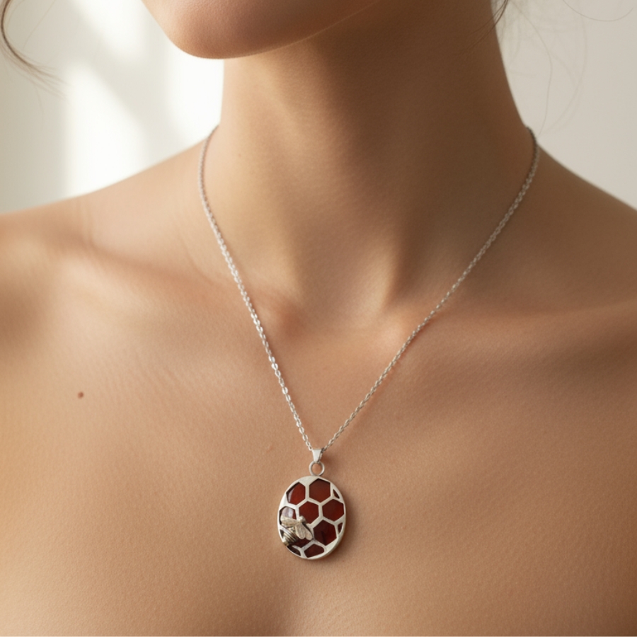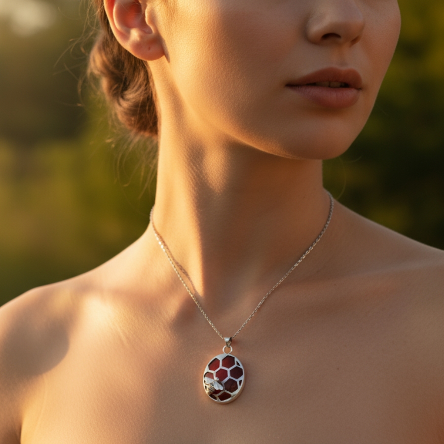 Designed and handcrafted in North Vancouver by Hedieh Ahmari, Heart of the Hive embodies devotion, connection, and purpose. The red agate mirrors the pulse of life, while the bee — a timeless symbol of hard work and harmony — reminds us that even the smallest beings create the sweetest miracles.