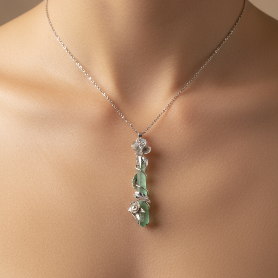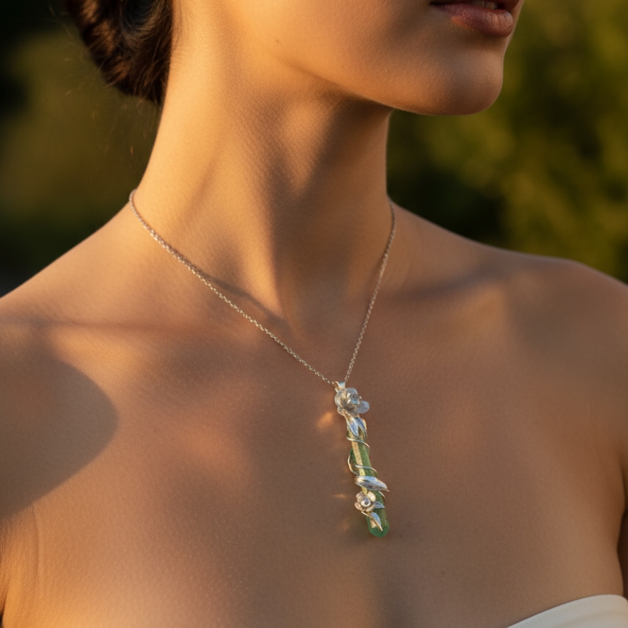 Handcrafted in North Vancouver by Hedieh Ahmari, this pendant captures the harmony between nature and artistry. Silver vines embrace the aventurine stone, symbolizing growth and renewal, while hand-sculpted flowers add a touch of organic grace. Each piece is one of a kind — a small reflection of nature’s quiet beauty, preserved in silver.
