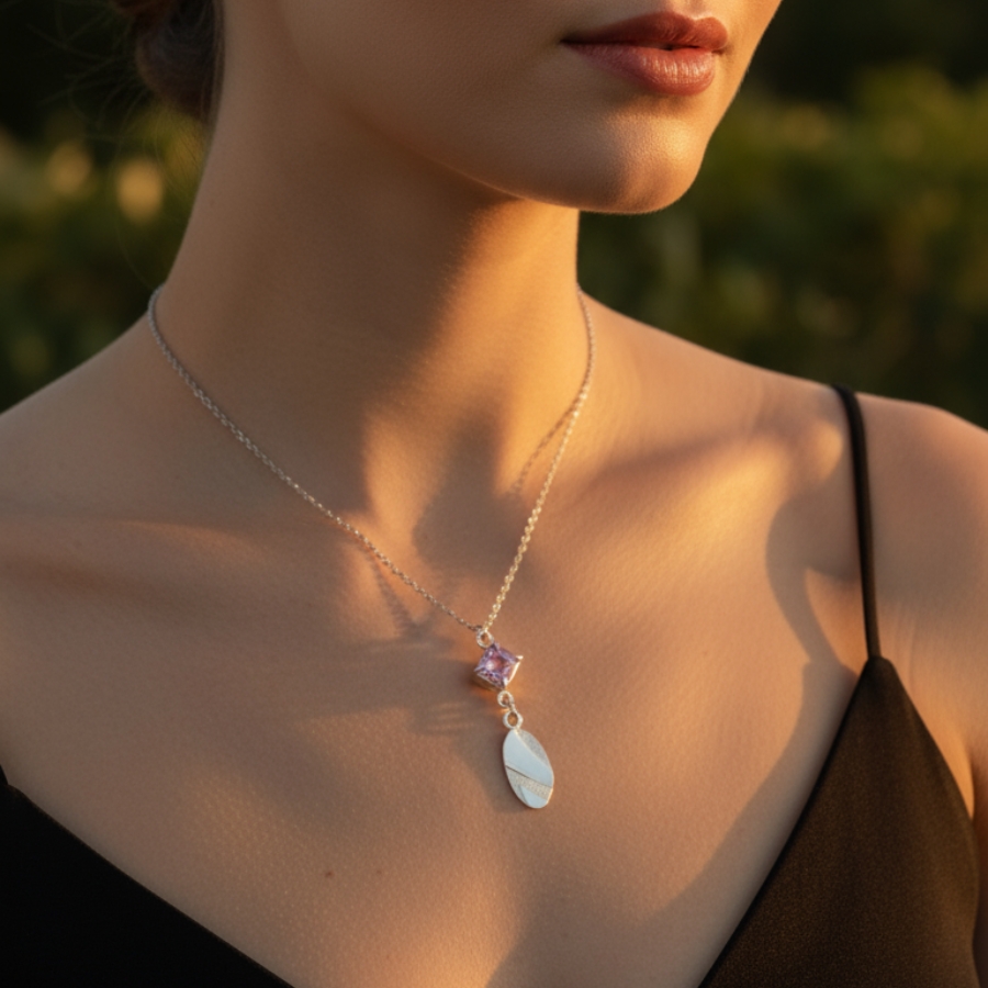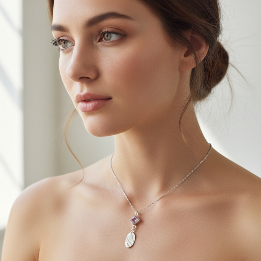 Delicate yet bold, this pendant pairs a faceted lilac cubic zirconia with a handcrafted sterling silver form — a fusion of light and structure. The soft glow of the stone meets the textured silver surface, symbolizing balance between emotion and strength. Elegant and expressive, it’s a wearable sculpture for those who find beauty in contrast.