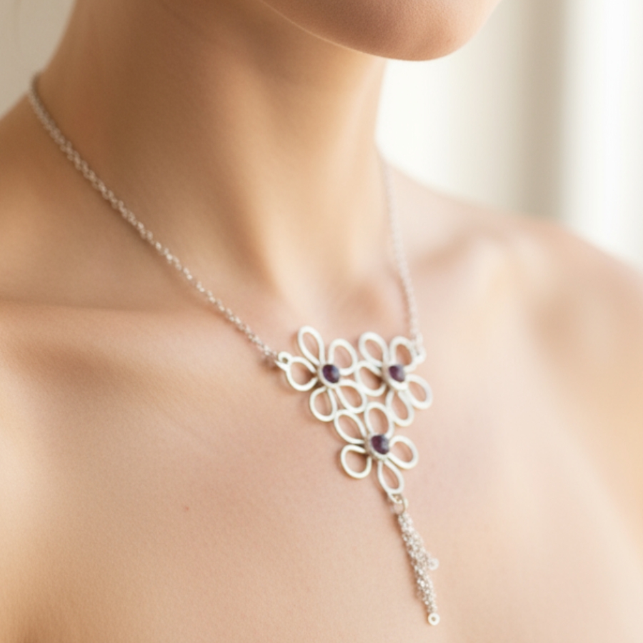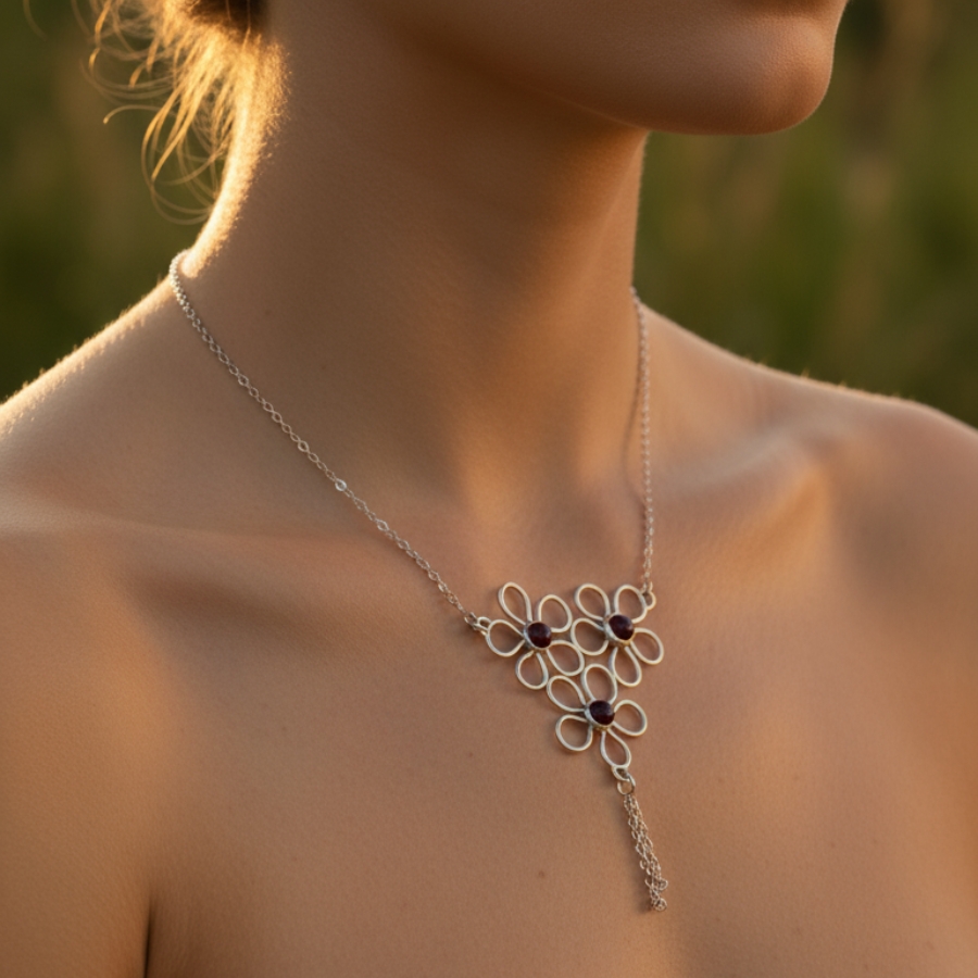 This handcrafted sterling silver necklace features three delicate flowers, each adorned with a deep garnet cabochon at its heart. The open petal design brings a sense of movement and lightness, while the soft cascade of silver chains below adds a graceful touch. Radiant yet understated, this piece captures the essence of hand-formed artistry and natural balance.