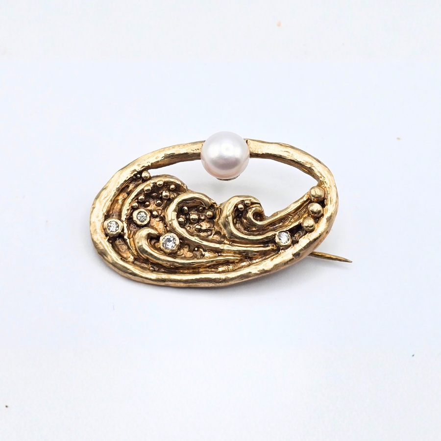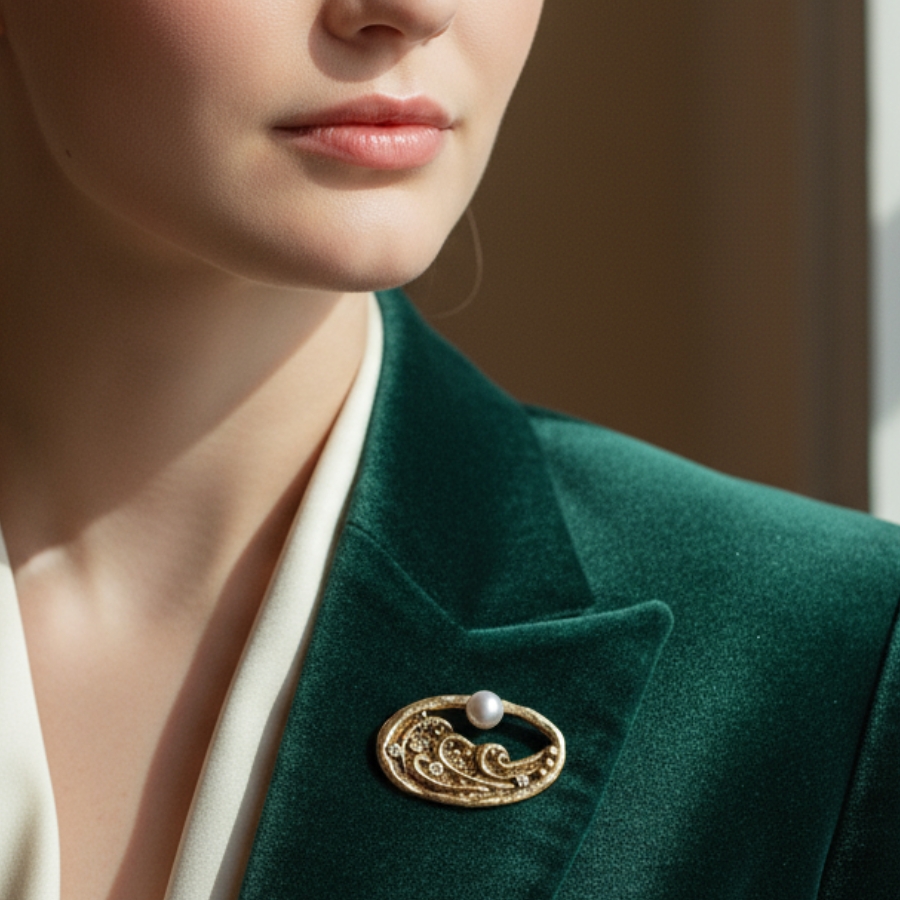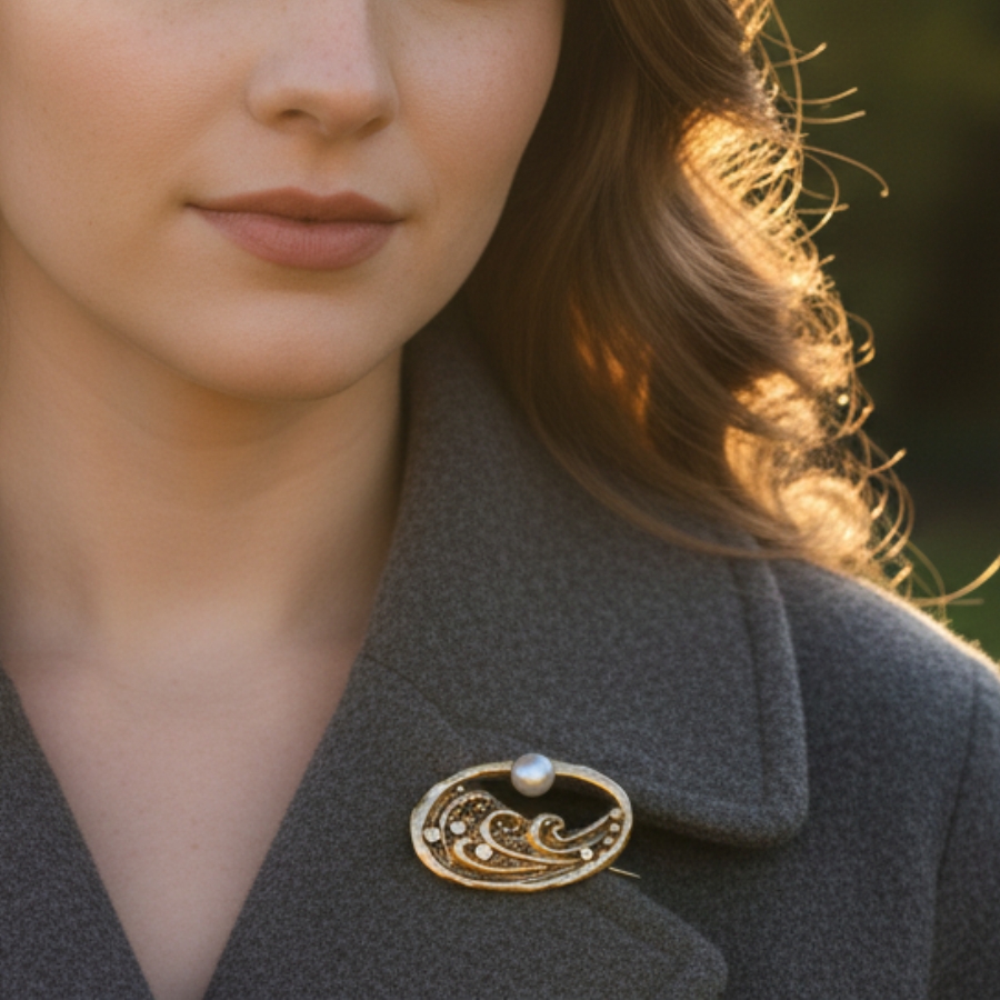 Yakamoz captures the serene poetry of moonlight reflecting over rippling waves. Cast in bronze and crowned with a luminous freshwater pearl, it glows with quiet movement. Delicate cubic zirconia stones shimmer like starlight scattered across the sea’s surface, echoing the Turkish word Yakamoz — the dance of light upon water.